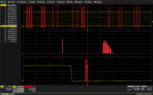 使用WaveScan快速搜索模拟、数字或并行总线信号的欠幅、毛刺或其他的异常。